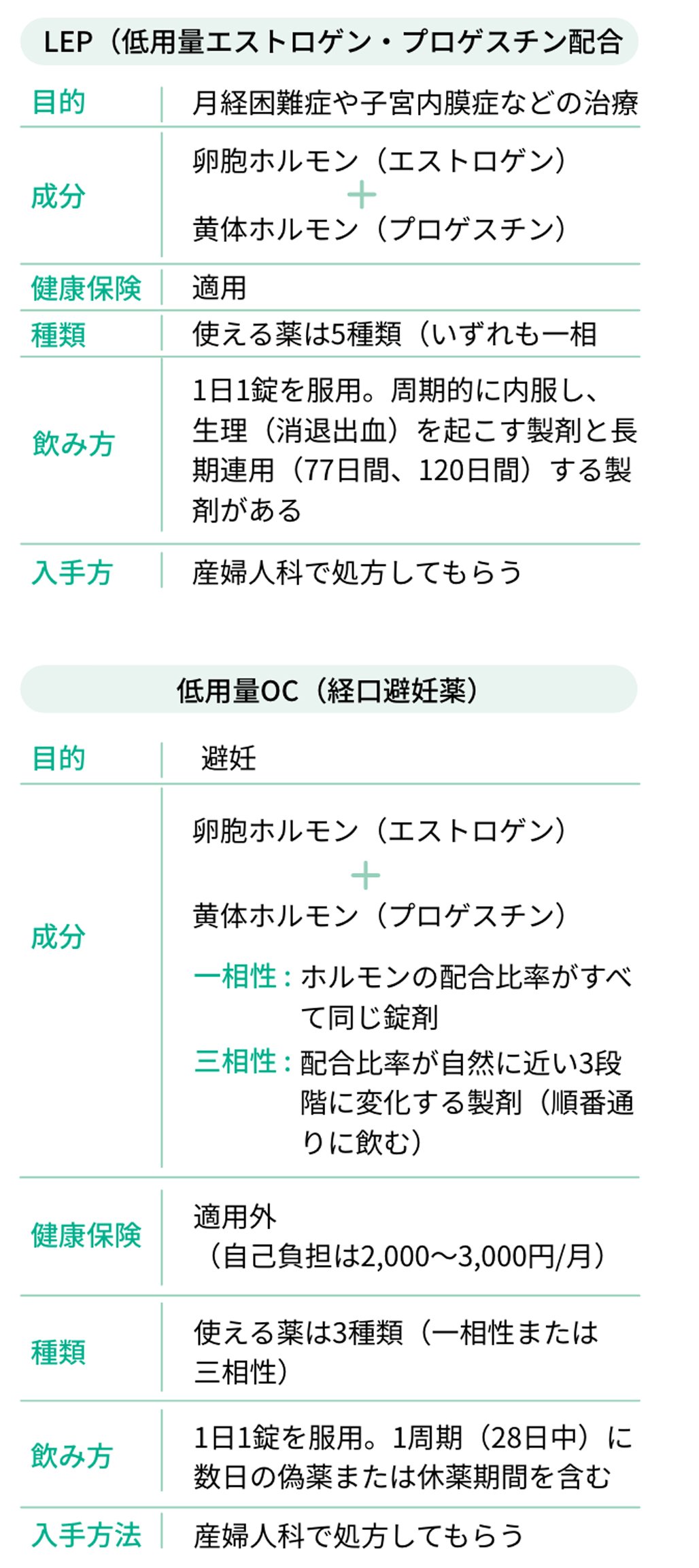 LEPとはLow dose Estrogen Progestinの略で、低用量エストロゲン・プロゲスチン配合薬のことです。LEP製剤は低用量OC(経口避妊薬)とほとんど同じ成分の医薬品ですが、LEP製剤は「月経困難症」や「子宮内膜症に伴う疼痛の改善」など病気の治療を目的として健康保険の適用となる一方、低用量OCは避妊を目的とし、自費診療(自己負担)となります【表1】。